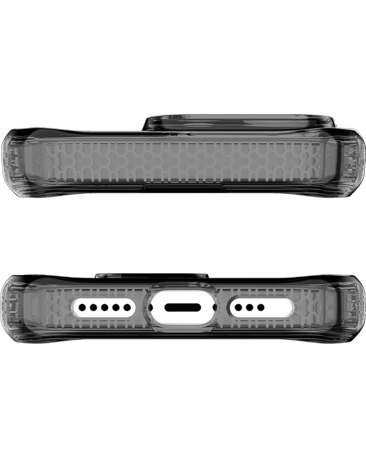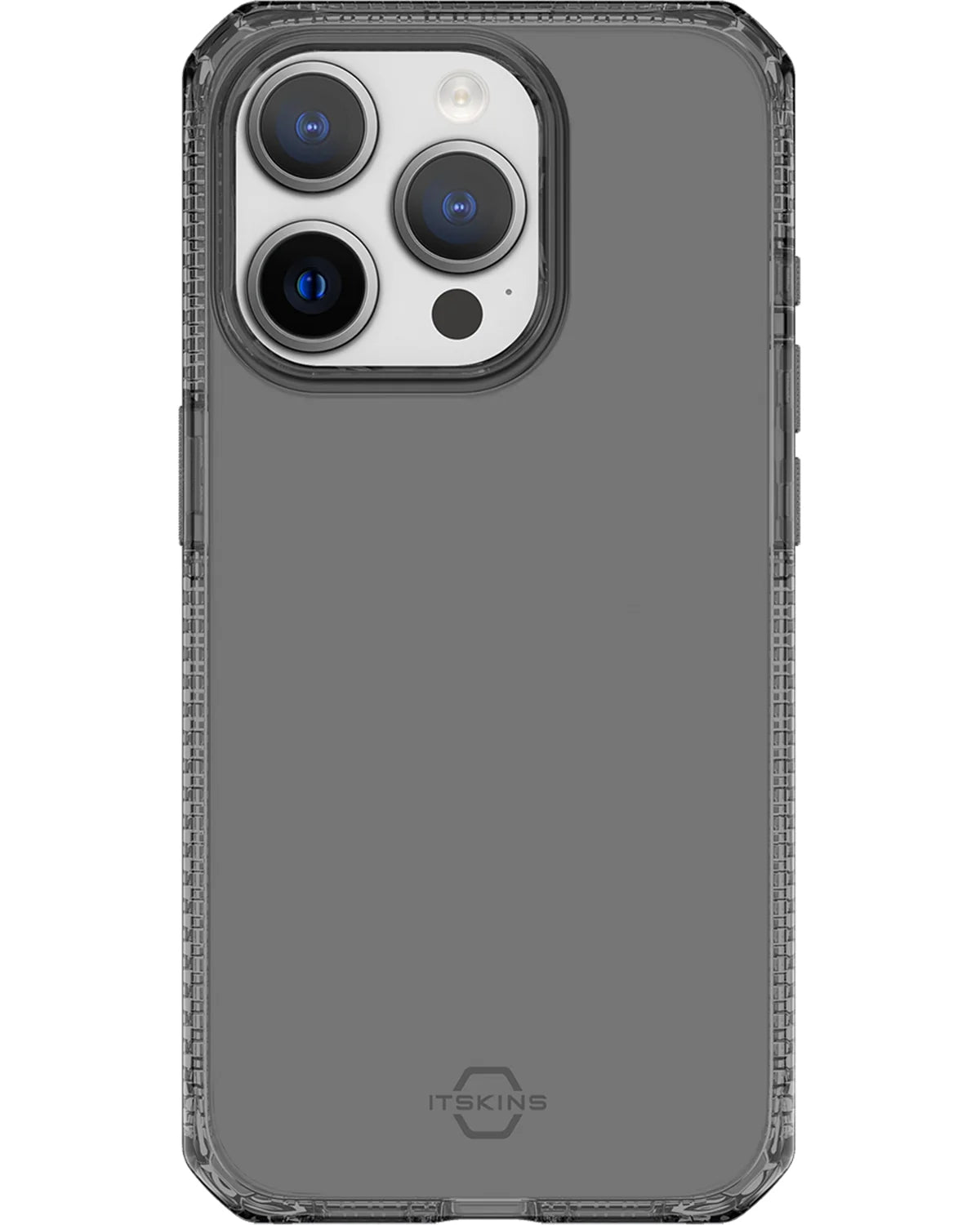 Het ITSKINS Level 2 SpectrumClear_R hoesje voor de Apple iPhone 15 Pro combineert flexibele bescherming met een slank rookgrijs design en hoogwaardige duurzaamheid.