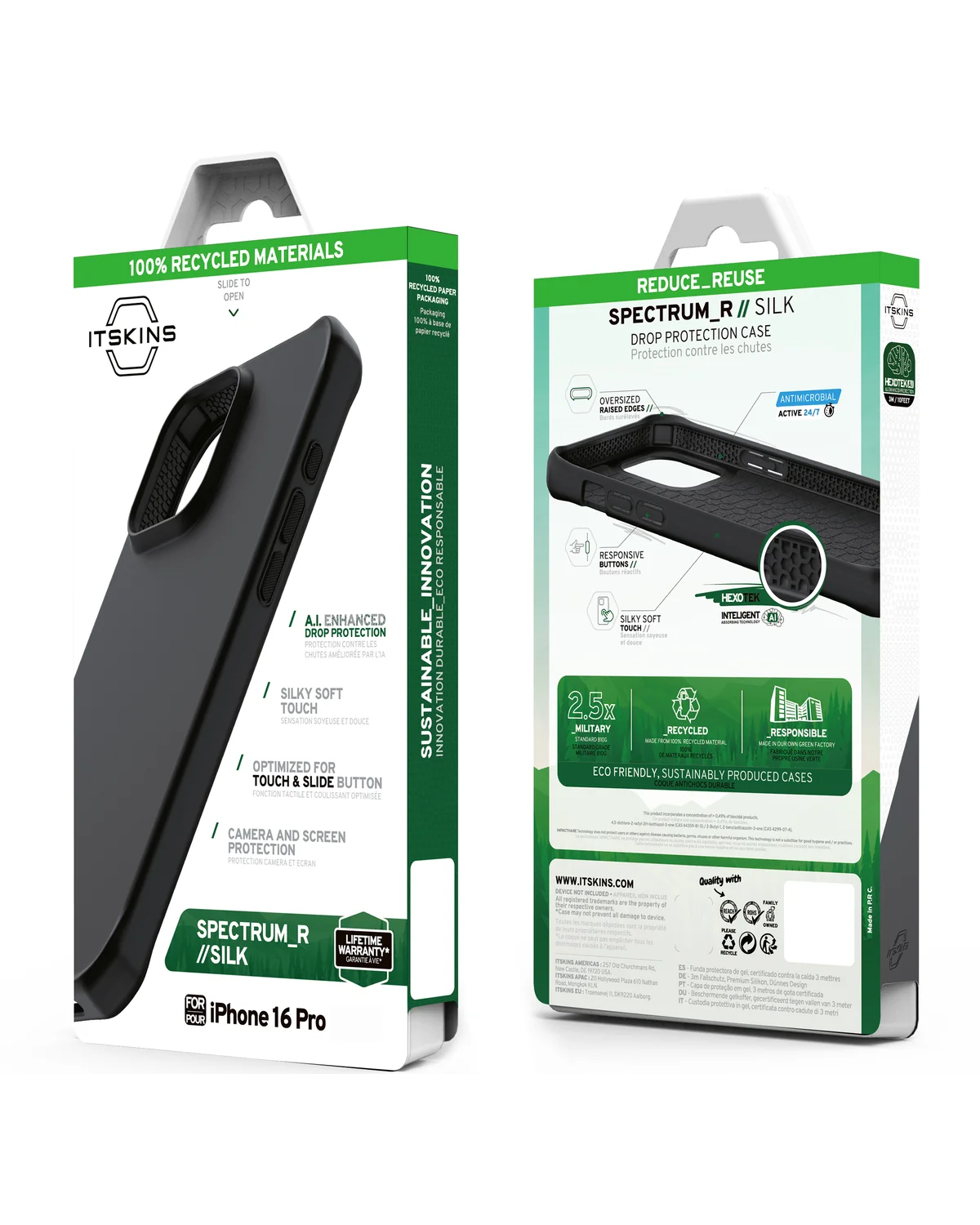 Het SpectrumSilk_R hoesje is volledig gemaakt van gerecycled materiaal en voorzien van antimicrobiële technologie. Zo blijft je toestel beschermd tegen stoten én ziektekiemen. De knoppen zijn ultra-responsief en zorgen voor een vlotte bediening. Praktisch, duurzaam en hygiënisch tegelijk.