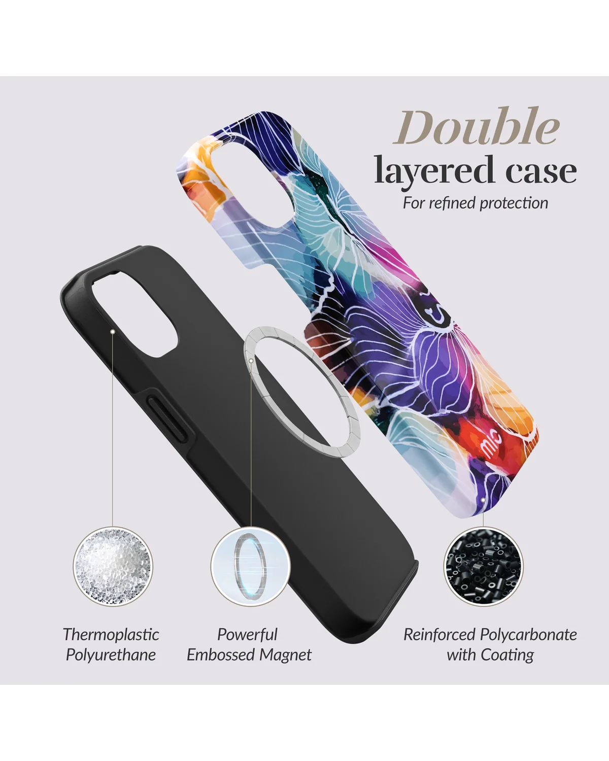 Het unieke ontwerp in rijke tinten zoals paars, blauw, turquoise en oranje geeft je toestel een kunstzinnige uitstraling. De glossy afwerking zorgt voor een luxe feel, terwijl de hybride constructie – een schokabsorberende TPU-laag in combinatie met een harde polycarbonaat buitenzijde – uitstekende bescherming biedt tegen stoten en krassen. De ingebouwde MagSafe-magneet maakt de case volledig compatibel met je favoriete accessoires. Dankzij verhoogde randen blijft ook je scherm en camera optimaal beschermd, zonder afbreuk te doen aan gebruiksgemak.