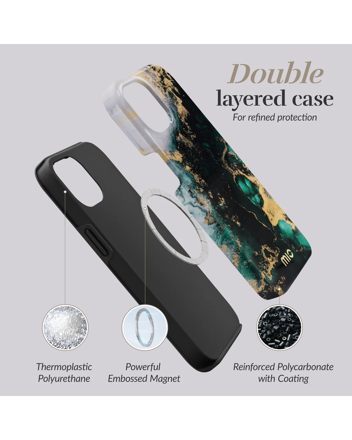 De glanzende afwerking laat het unieke patroon tot leven komen: diepe groentinten gemixt met zwart, wit en metallic goud. De hybride constructie biedt optimale bescherming met een schokabsorberende TPU-binnenlaag en een harde, gecoate polycarbonaat buitenkant. Dankzij de ingebouwde MagSafe-magneet klik je accessoires zoals opladers en houders stevig vast. Verhoogde randen rond het scherm en de camera zorgen voor extra veiligheid, terwijl de nauwkeurige uitsparingen een soepele bediening garanderen.