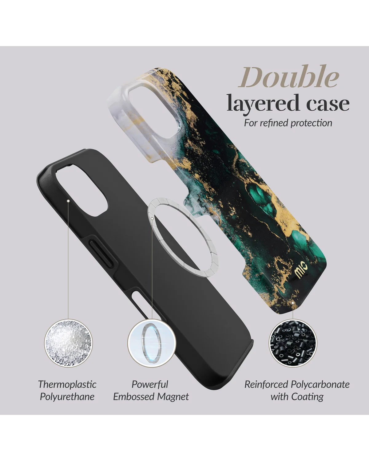 De Mio Green Marble Case biedt optimale bescherming dankzij de combinatie van flexibel TPU en stevig polycarbonaat. De Air Cushion-technologie en opstaande randen om schade aan je scherm te voorkomen beschermen je toestel effectief tegen vallen en stoten. De MagSafe-compatibiliteit zorgt ervoor dat draadloos opladen en magnetische accessoires naadloos blijven werken, zonder in te leveren op stijl.
