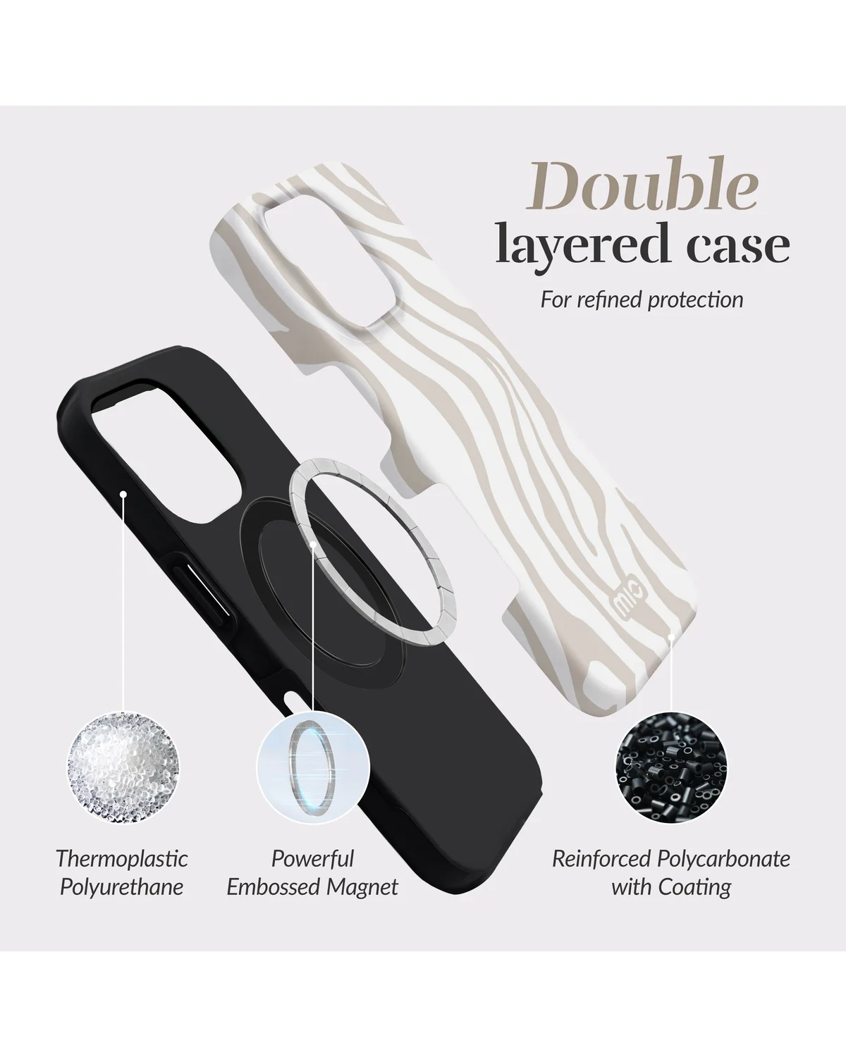 De Mio Sandy Zebra onderscheidt zich door zijn matte, zijdezachte afwerking en zachte kleurenpalet. De hybride constructie met MagSafe-ondersteuning zorgt voor betrouwbare grip en bescherming, terwijl het design perfect past bij een eigentijdse en natuurlijke look.