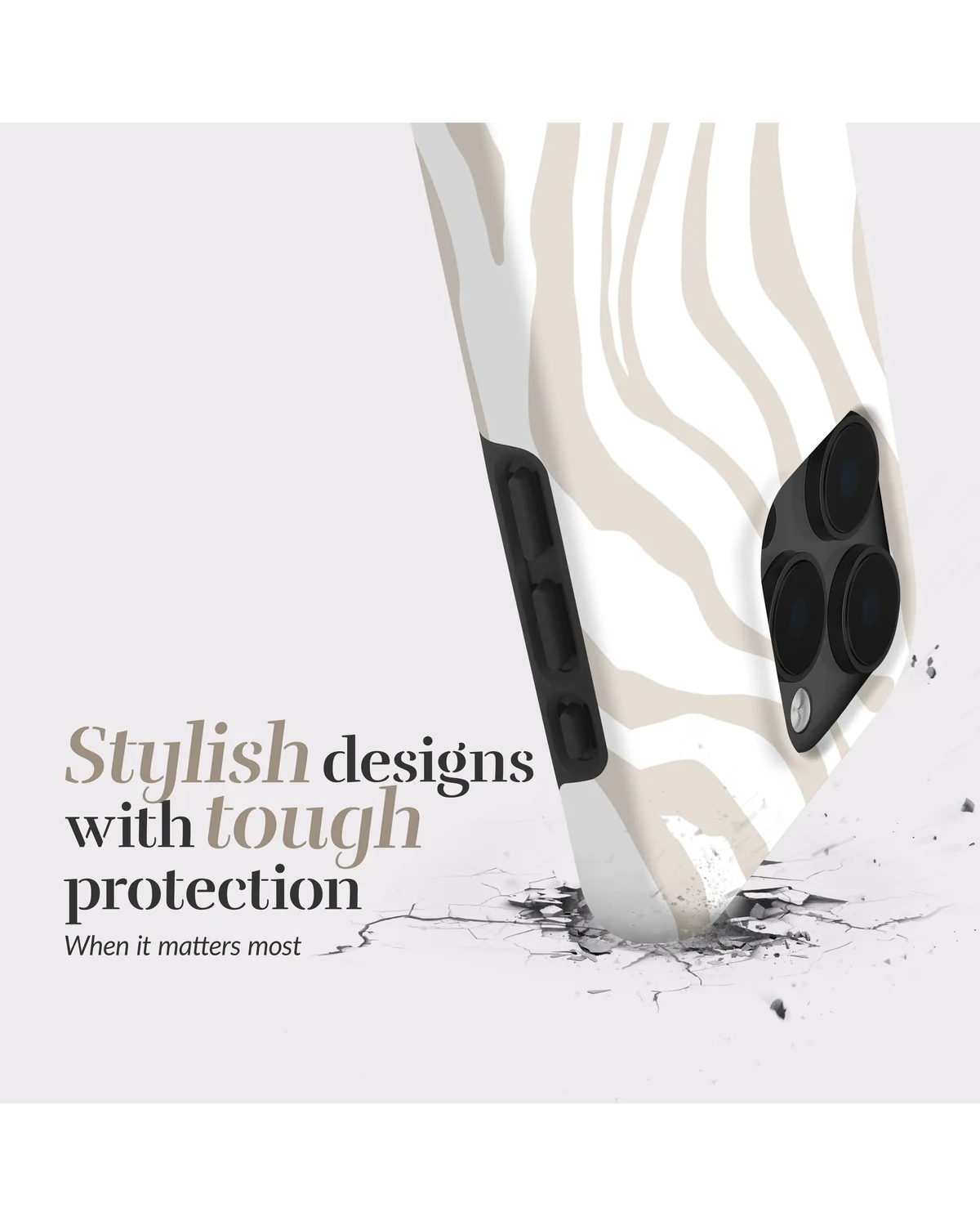 Dit Mio Sandy Zebra hoesje combineert stevigheid met stijlvolle elegantie. De dubbele laag en verhoogde randen beschermen je telefoon optimaal. De taupe-witte matte afwerking voelt prettig aan en geeft elke outfit een subtiele boost.