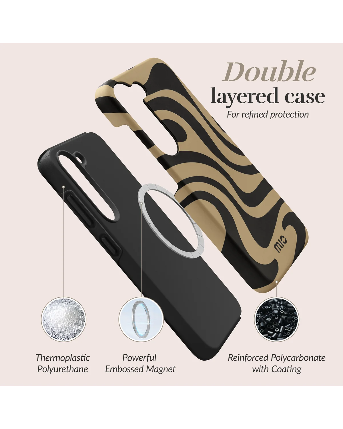 Dit zwart-bruin MagSafe compatibel telefoonhoesje van Mio By Mobilize voor de Samsung Galaxy A15 4G/5G combineert stijl, veiligheid en functionaliteit. De unieke Swirl-print maakt van jouw smartphone een echte eyecatcher.