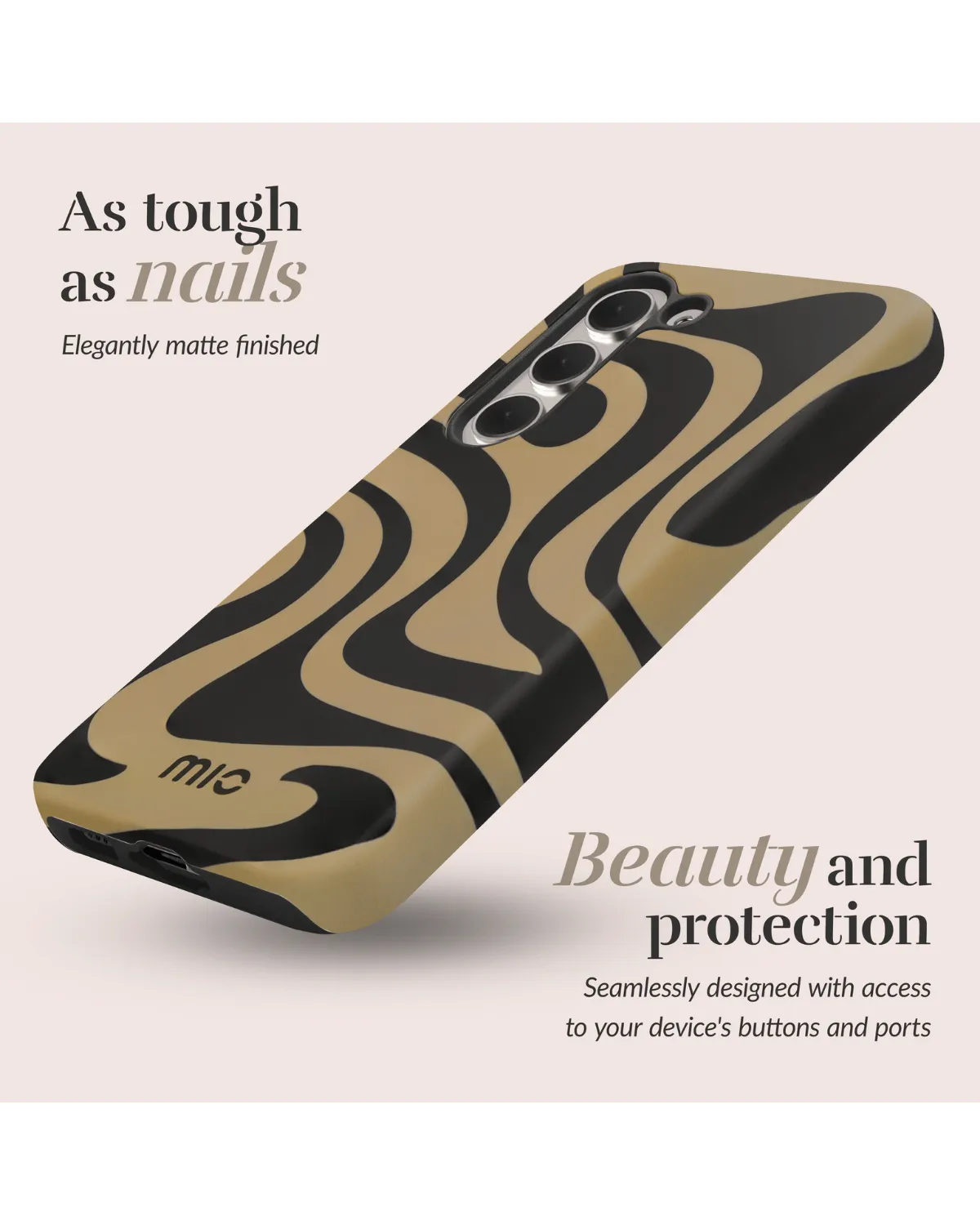 Het creatieve swirl design in zwart en bruin maakt van je toestel een echte blikvanger. De verhoogde randen beschermen je scherm tegen krassen, terwijl het stevige ontwerp zorgt voor een veilige pasvorm en langdurige bescherming.