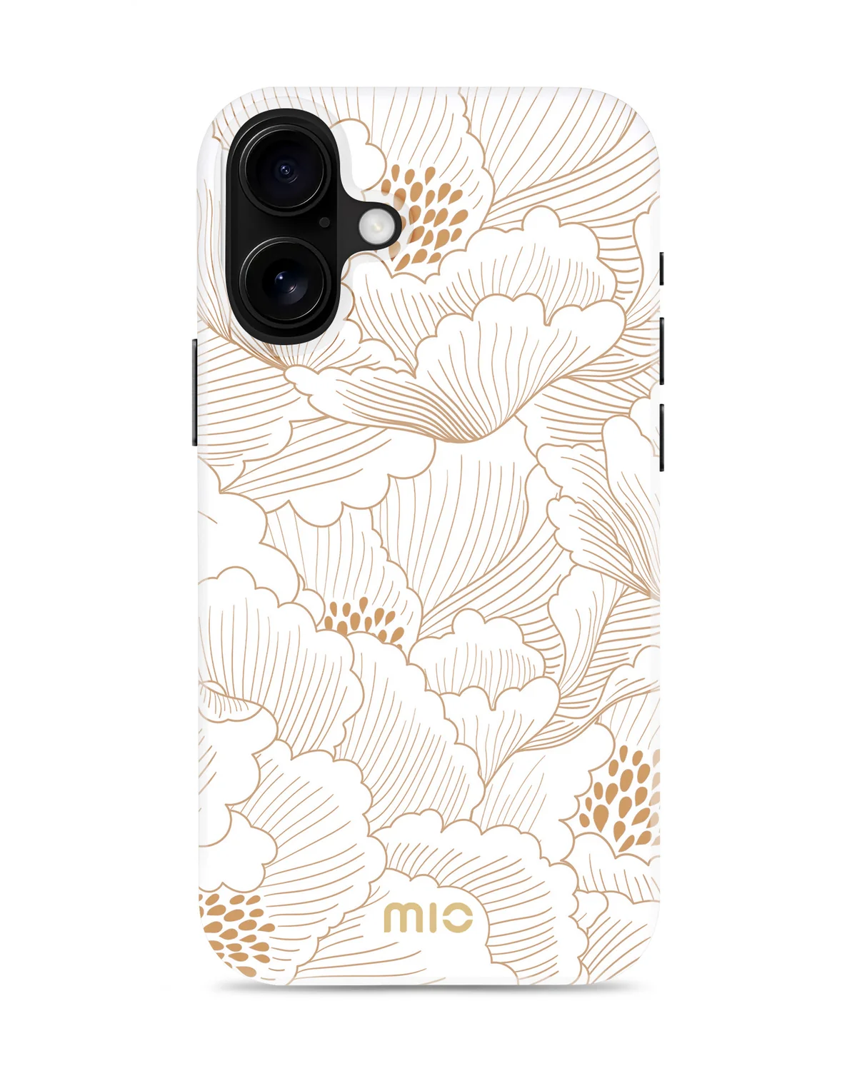 Breng stijl en bescherming samen met de Mio White Roses MagSafe Compatible Case voor je iPhone 16 Plus. Deze witte back cover met elegante gouden bloemenprint straalt verfijning en klasse uit.