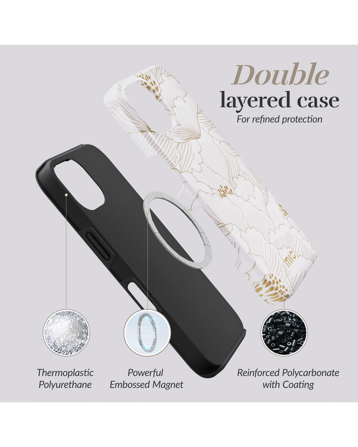 De Mio White Roses Case biedt optimale bescherming door de combinatie van flexibel TPU en stevig polycarbonaat. Air Cushion-technologie en opstaande randen om schade aan je scherm te voorkomen zorgen voor extra veiligheid tegen stoten en vallen. Dankzij de ingebouwde MagSafe-compatibiliteit laad je moeiteloos draadloos op en bevestig je accessoires eenvoudig.