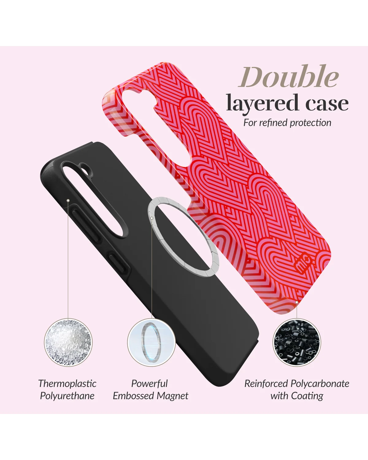 Dit roze MagSafe telefoonhoesje van Mio By Mobilize voor de Samsung Galaxy A15 4G/5G combineert een romantisch Wild Hearts-design met betrouwbare bescherming.