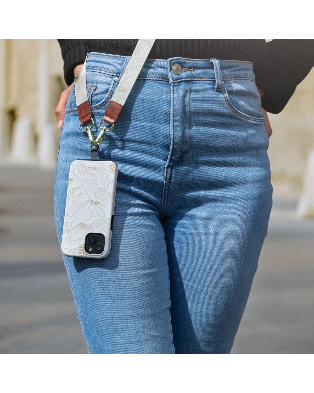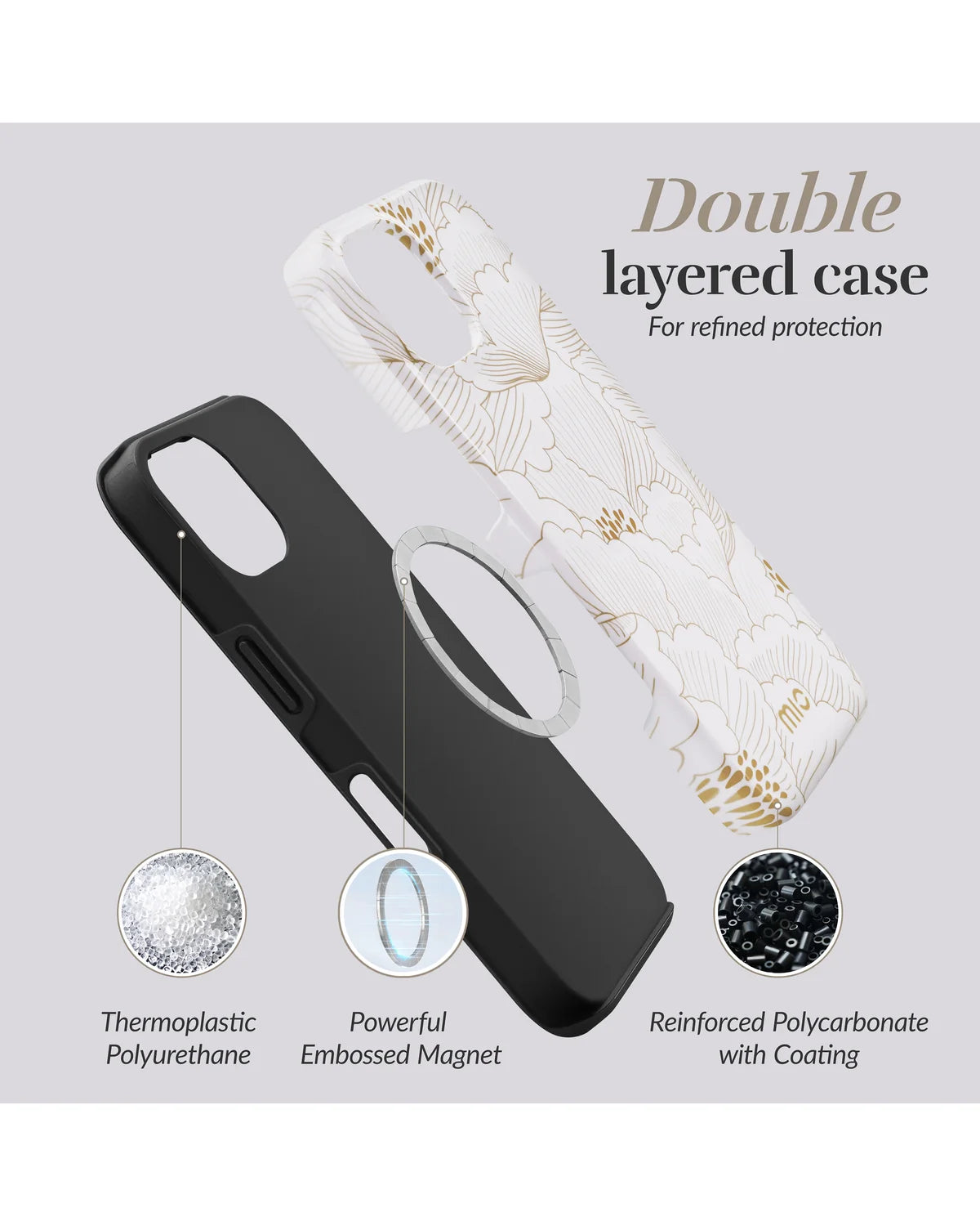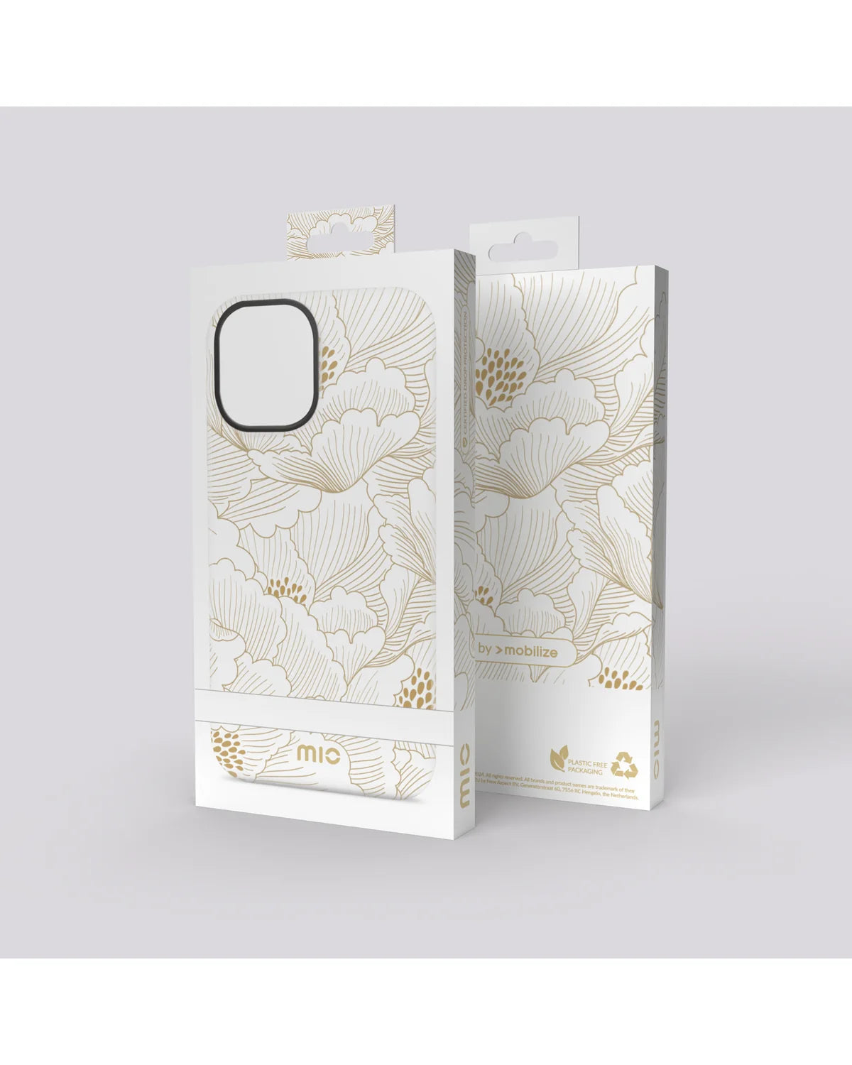 Het Mio by Mobilize White Roses MagSafe Compatibel Hoesje geeft jouw Apple iPhone 17 Pro Max een elegante en romantische uitstraling dankzij het verfijnde bloemenpatroon in zachte goudtinten.