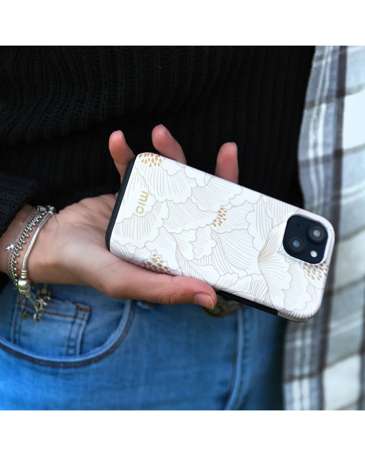 Het Mio by Mobilize White Roses MagSafe Compatibel Hoesje geeft jouw Samsung Galaxy S25 Fe 5G een elegante en romantische uitstraling dankzij het verfijnde bloemenpatroon in zachte goudtinten.