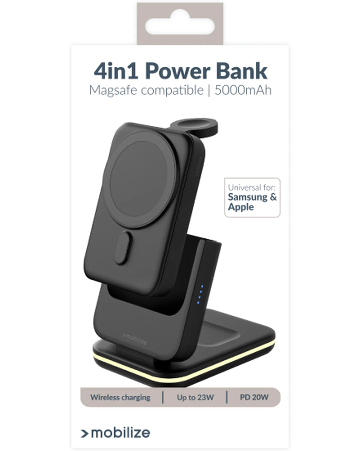 Multifunctioneel gemak met de Mobilize 4-in-1 Wireless Charger. Inclusief 5000mAh powerbank, 23W draadloos laden en compact design. Ideaal voor thuis én onderweg.