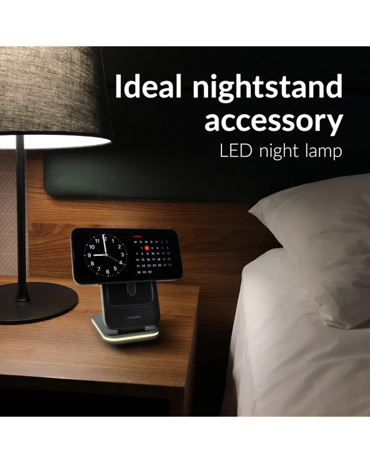 Deze draadloze 4-in-1 oplaadhub van Mobilize combineert een oplaadstation en een afneembare powerbank. Laad tot drie apparaten tegelijk op – iPhone of Android, Apple Watch en AirPods – met tot 23W totaalvermogen. Dankzij MagSafe-compatibiliteit blijft je toestel stevig op z’n plek, en de geïntegreerde LED-ring geeft subtiele sfeerverlichting. Ideaal voor je nachtkastje of onderweg door het opvouwbare design.