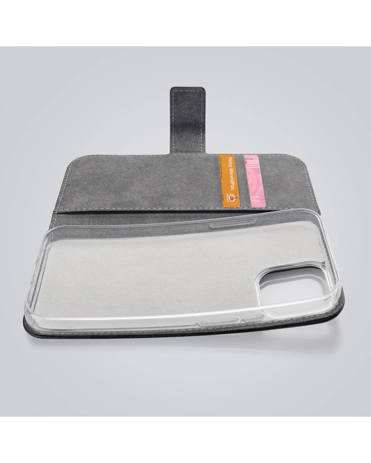 De buitenzijde is gemaakt van glad PU kunstleer, terwijl de binnenkant is afgewerkt met een zachte grijze voering. Je iPhone 15 klik je eenvoudig vast in de transparante TPU Gelly cover, die flexibel is én je toestel stevig op z’n plek houdt. Dankzij de opstaande randen blijft je scherm goed beschermd tegen krassen. Aan de linkerzijde bevinden zich twee pasjesvakken en een verticaal vak voor briefgeld. De flap met geïntegreerde magneet zorgt ervoor dat het hoesje goed gesloten blijft. Door het compacte formaat en de nette afwerking neem je het moeiteloos overal mee naartoe. En natuurlijk is deze case geschikt voor draadloos opladen.