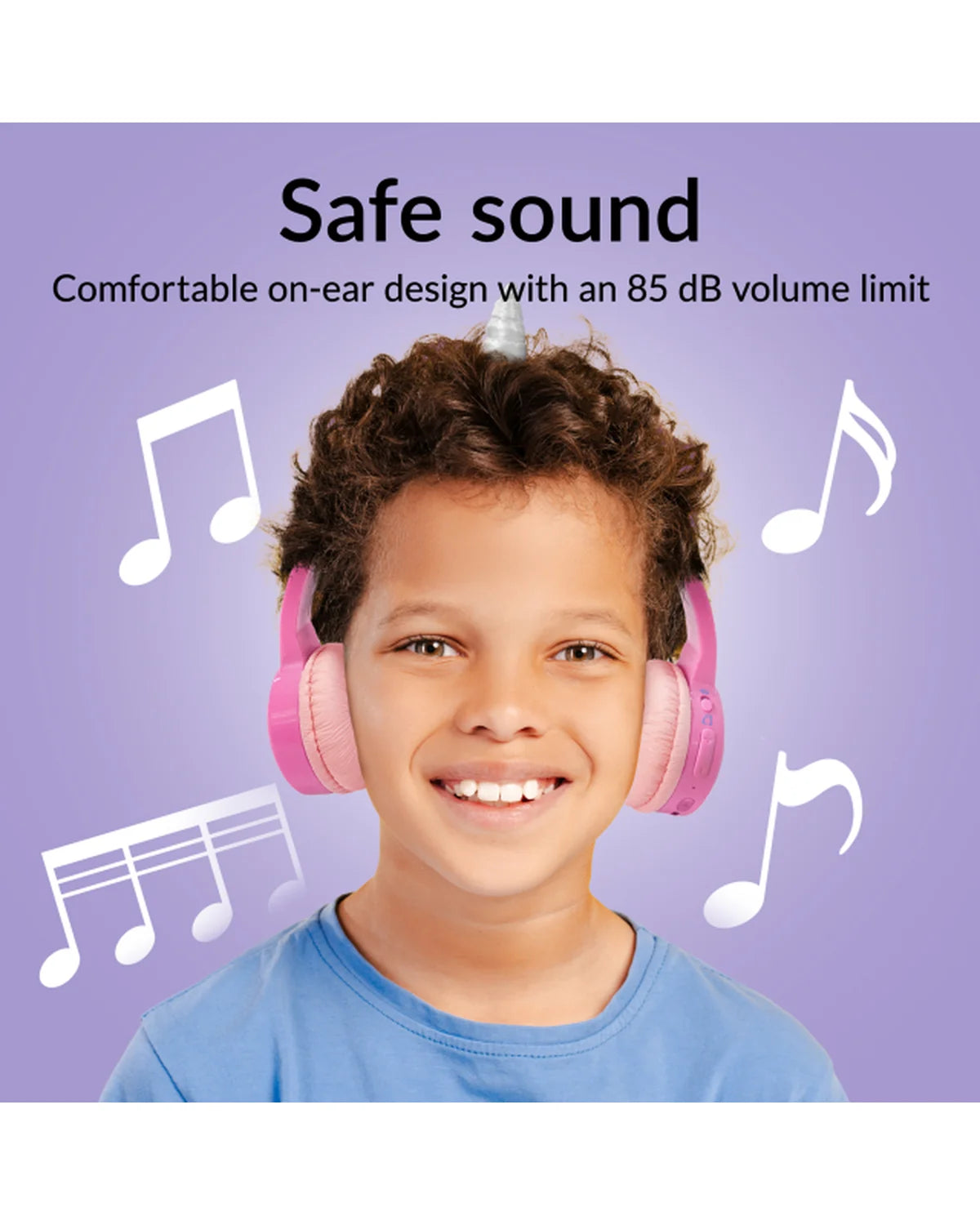 Laat kinderen veilig en stijlvol luisteren met deze draadloze unicorn koptelefoon van Mobilize. Tot 24 uur batterij, Bluetooth 5.3, 85 dB volume limiter en AUX – ideaal voor thuis, school of onderweg.