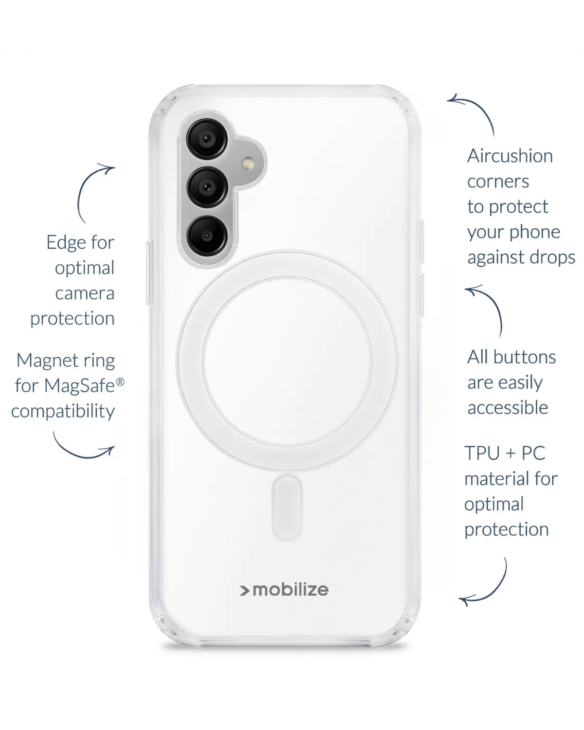 Bescherm je Samsung Galaxy A55 5G met de Mobilize Naked Protection Case. Dit transparante telefoonhoesje combineert een stevige kunststof achterkant met flexibele randen voor optimale schokabsorptie. Dankzij MagSafe-compatibiliteit sluit het hoesje perfect aan op MagSafe-accessoires.