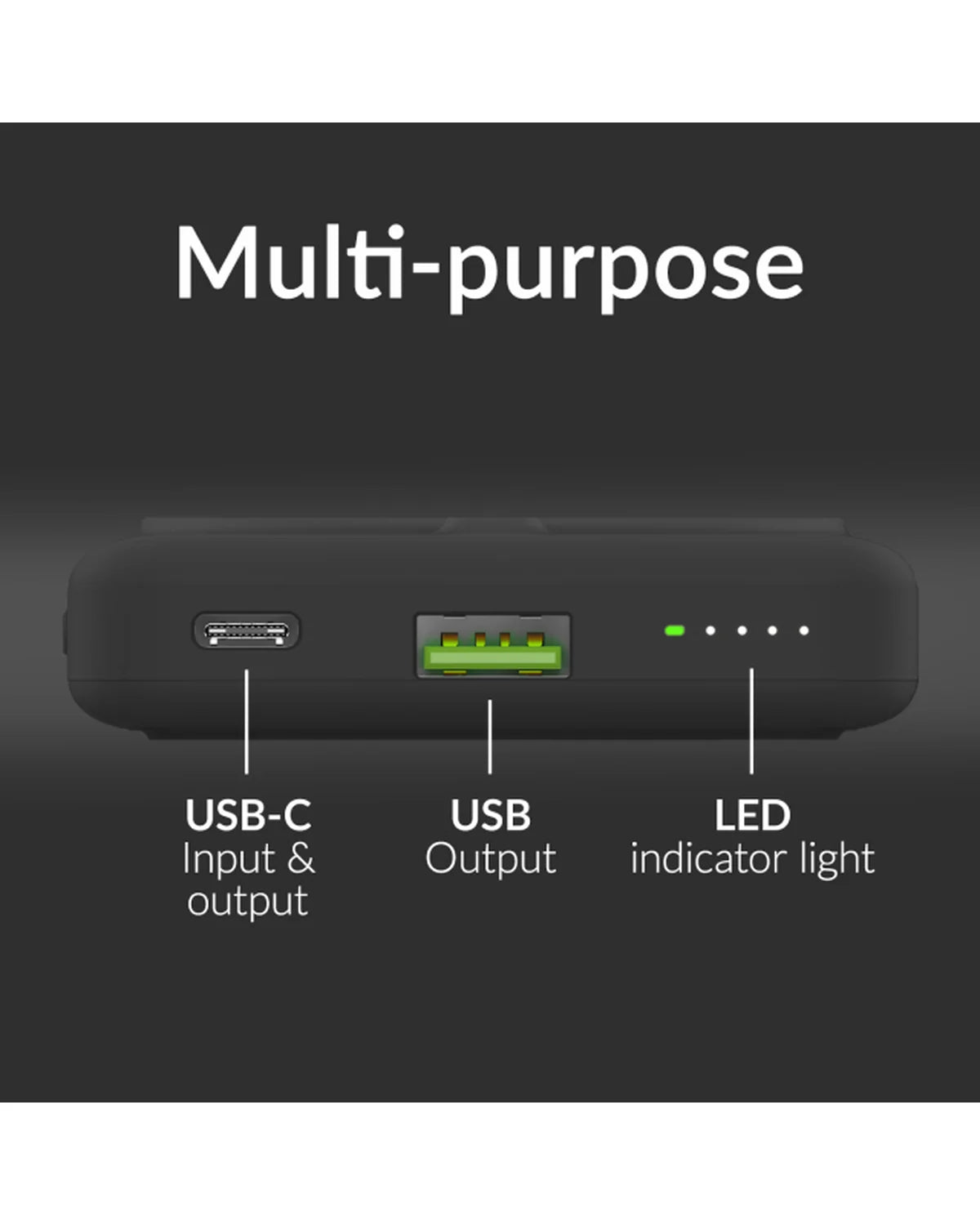 Deze 10000mAh powerbank combineert kracht en gemak. Dankzij MagSafe-technologie klik je je iPhone of ander draadloos oplaadbaar toestel moeiteloos vast. Laad tot 15W draadloos of tot 20W via de USB-C poort (in/out) of USB-A. De handige LED-indicator toont de batterijstatus en de uitklapbare standaard houdt je scherm perfect zichtbaar tijdens het opladen. Inclusief USB-C naar USB-C kabel.