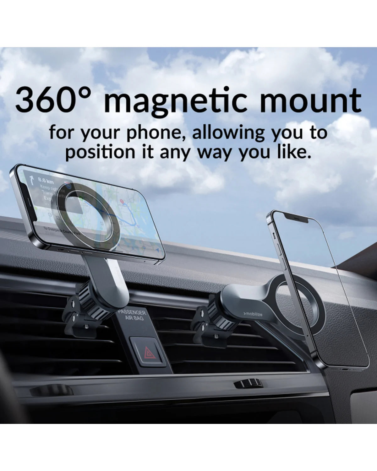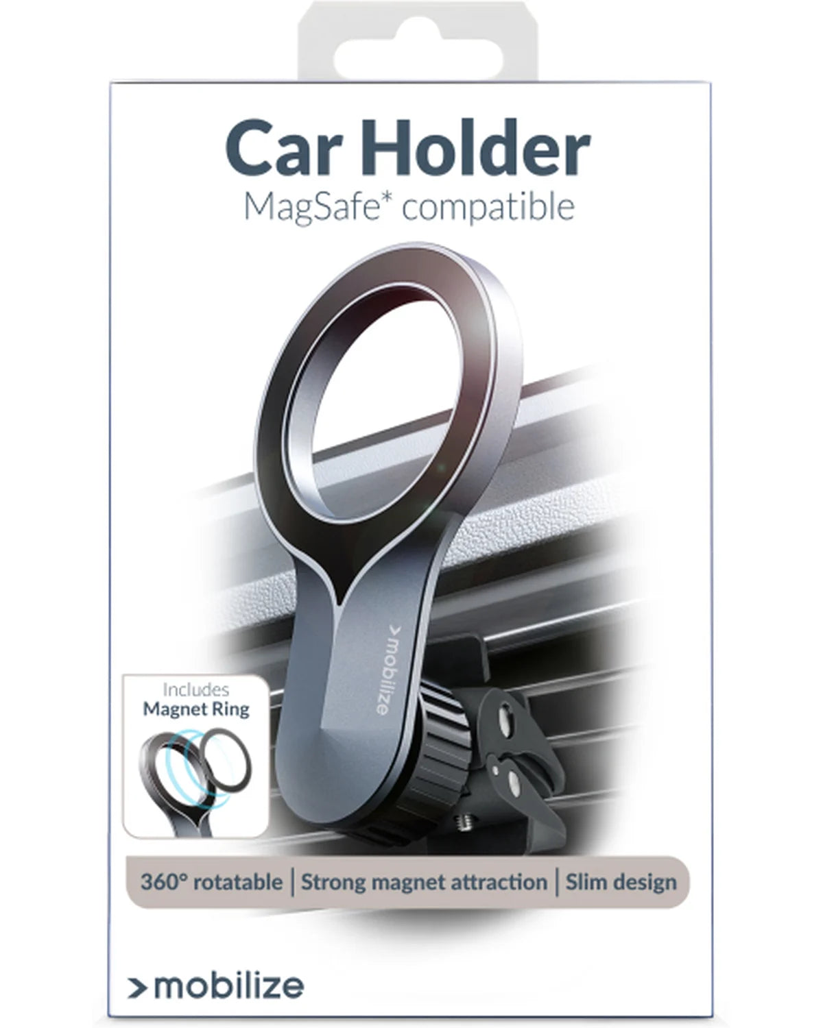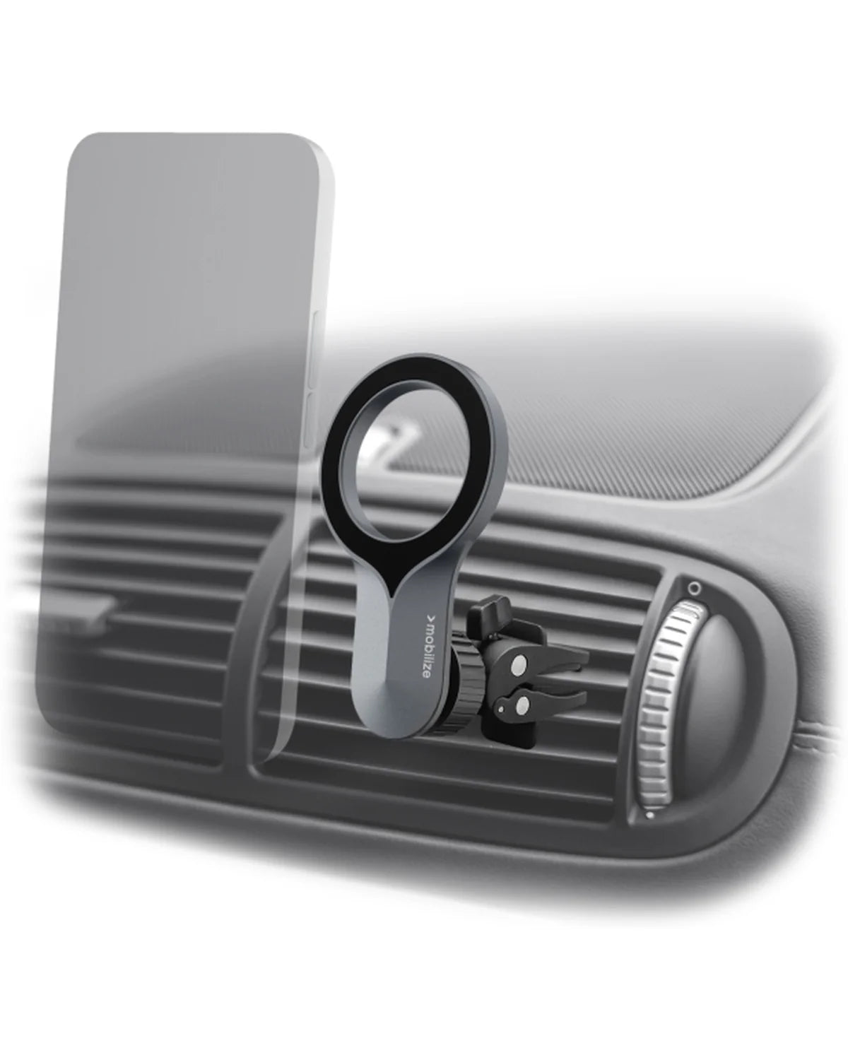 De zwarte Mobilize MagSafe Telefoonhouder voor het ventilatierooster biedt een stevige magnetische bevestiging én flexibele plaatsing. Deze MagSafe ventilatierooster houder is geschikt voor vrijwel alle smartphones, met of zonder MagSafe-ondersteuning.