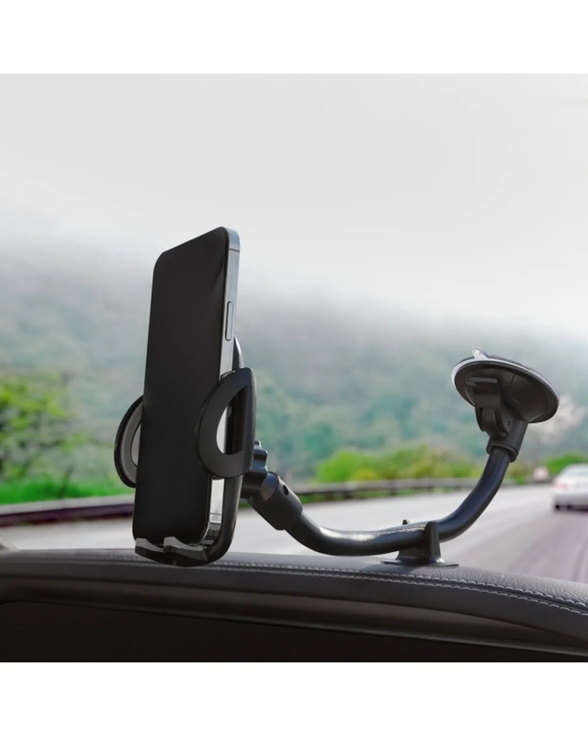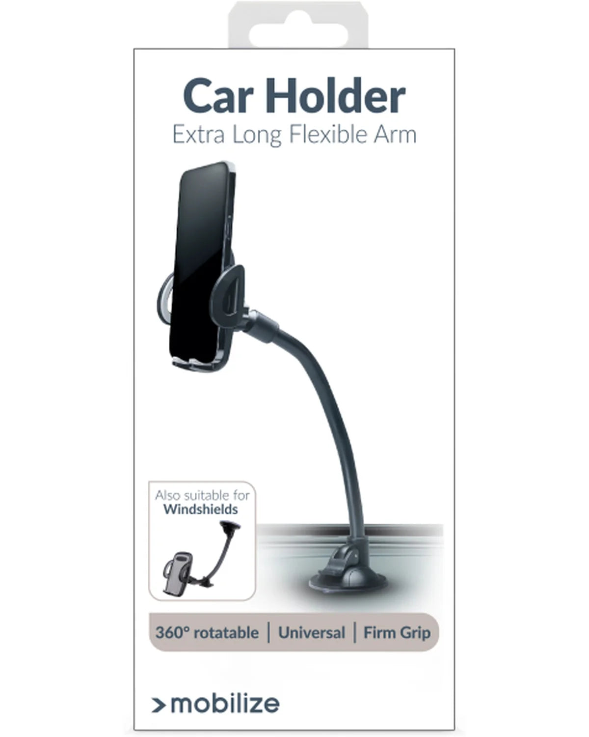 De zwarte Mobilize Telefoonhouder met zwanenhals biedt ultieme flexibiliteit dankzij de extra lange, buigbare arm. Ideaal voor gebruik op de voorruit of elk ander glad oppervlak. Universeel, stevig en volledig draaibaar.