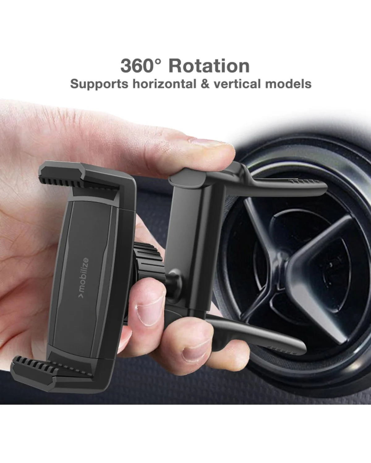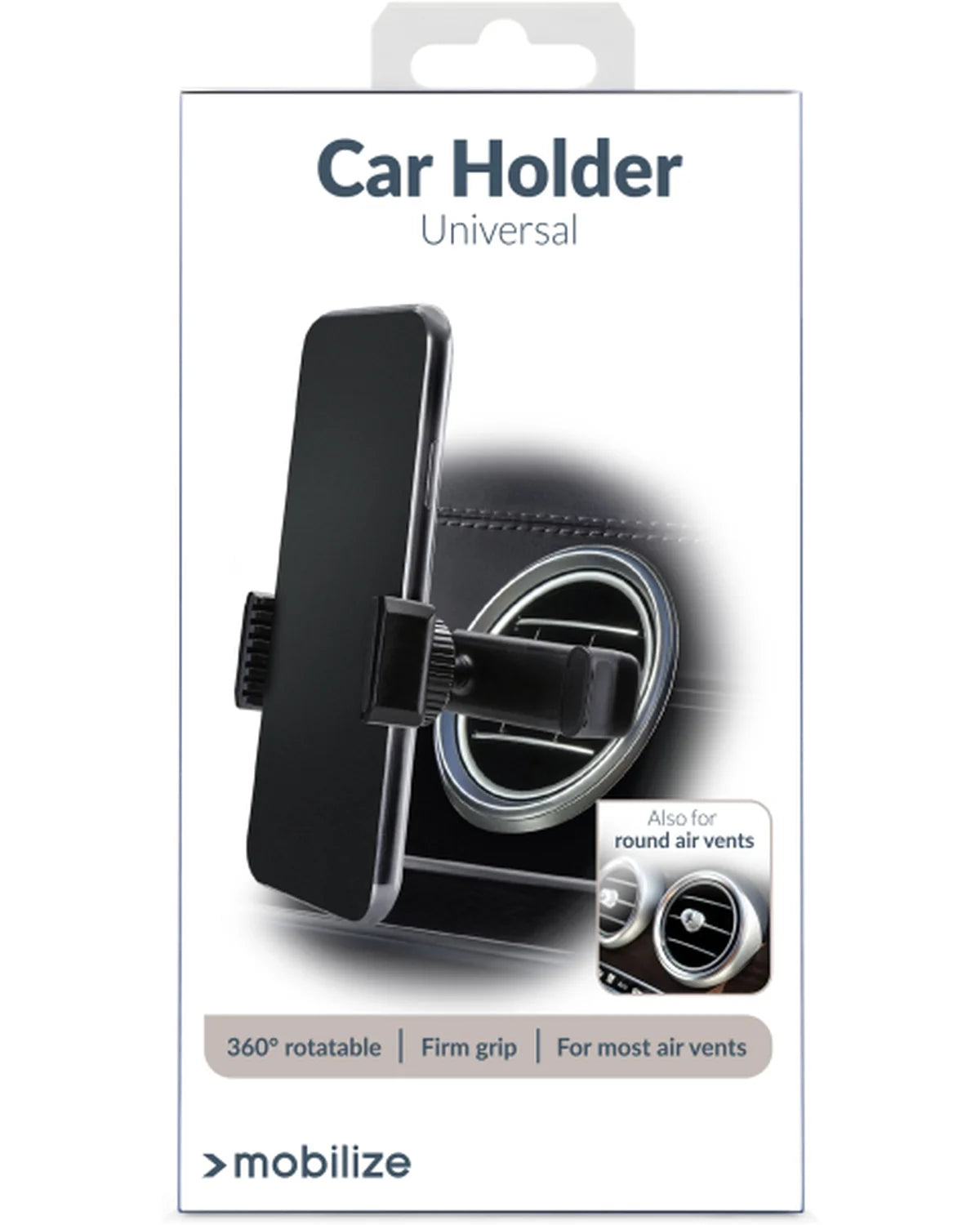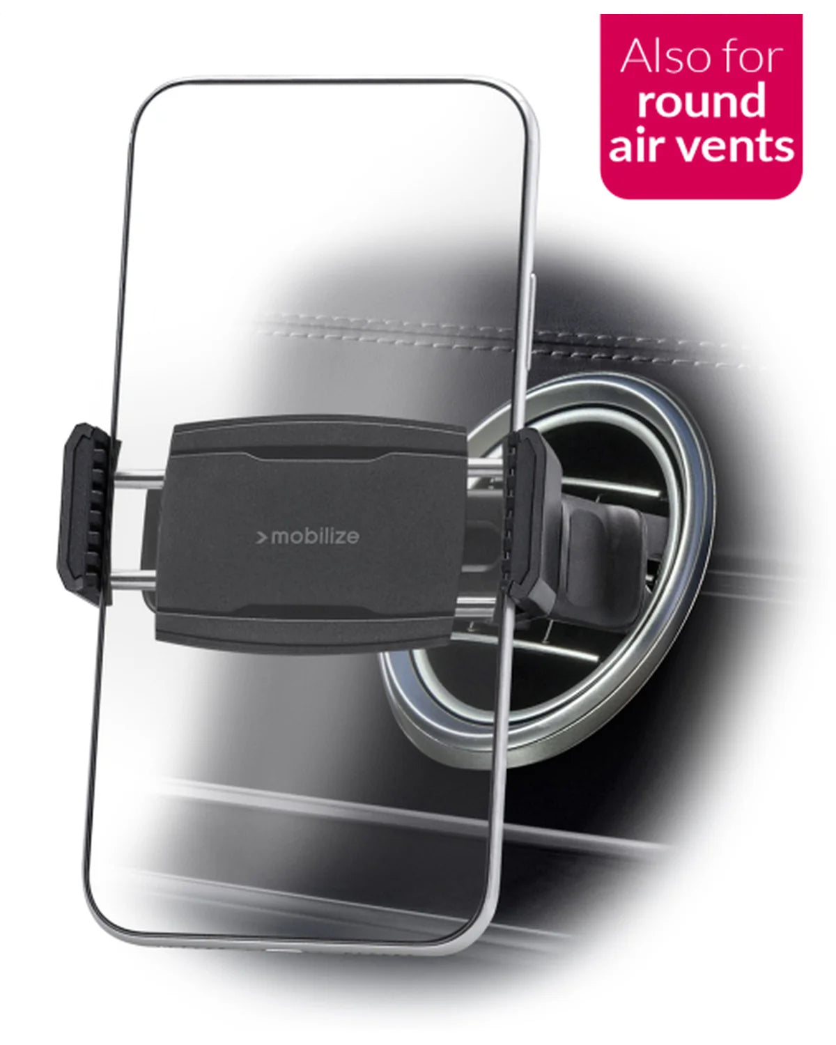 De zwarte Mobilize Universele Telefoonhouder voor ronde luchtroosters is dé oplossing voor auto's met lastig te combineren ventilatieroosters. Dankzij het slimme klemmechanisme en de verstelbare houder blijft je toestel stevig en goed zichtbaar.