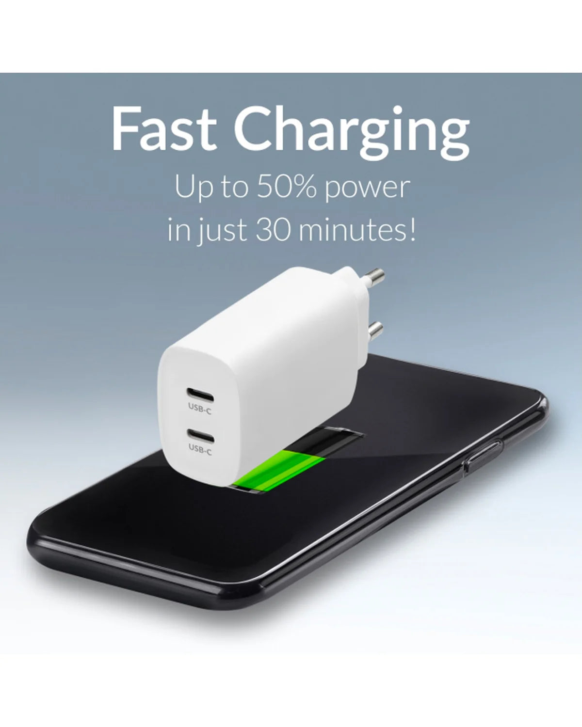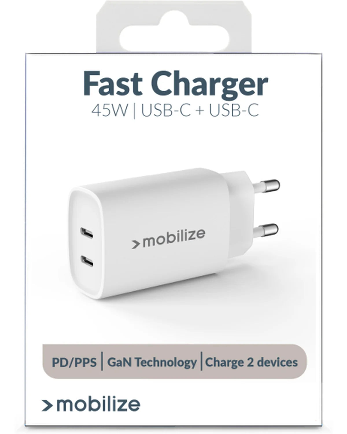 Witte 45W snellader van Mobilize met twee USB-C poorten, GaN-technologie en ondersteuning voor PD/PPS. Snel, slim en stijlvol opladen van al je apparaten.