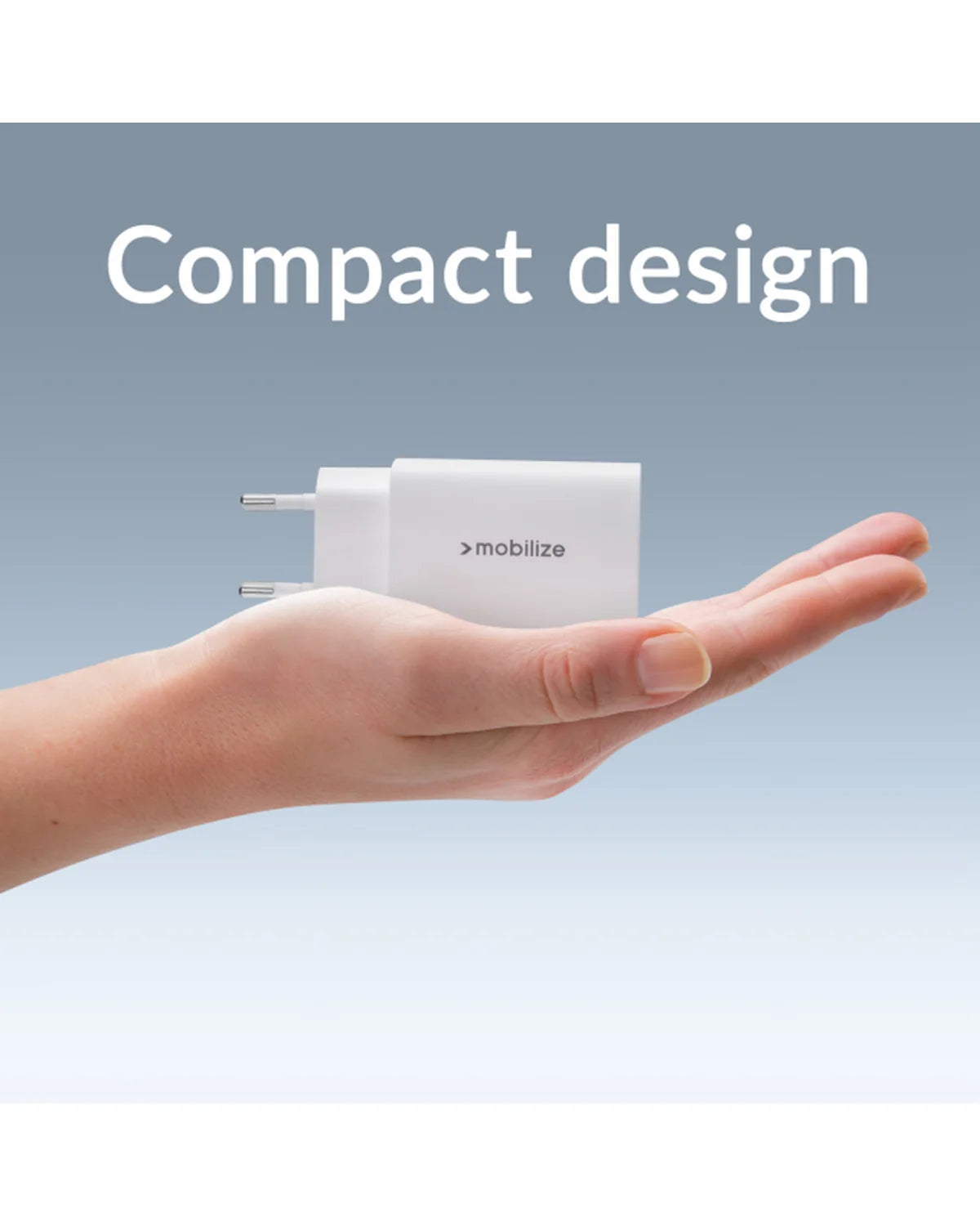 Deze krachtige Mobilize wandlader in wit combineert snelheid en efficiëntie in een compact ontwerp. Met 45W vermogen laad je moeiteloos één of twee apparaten tegelijk op. Dankzij PD en PPS technologie wordt je toestel tot 50% opgeladen in slechts 30 minuten. GaN zorgt voor hoge prestaties met minimale warmte.