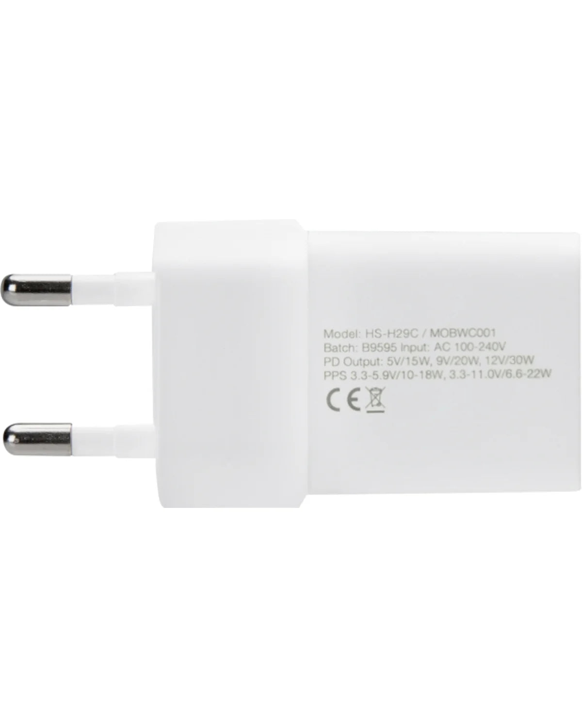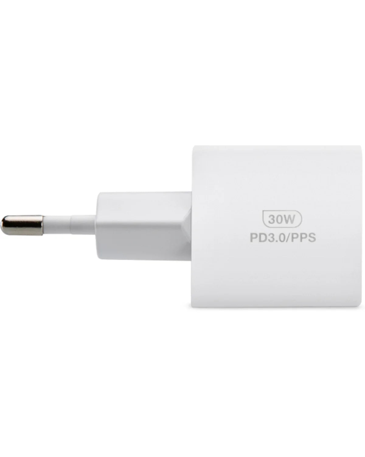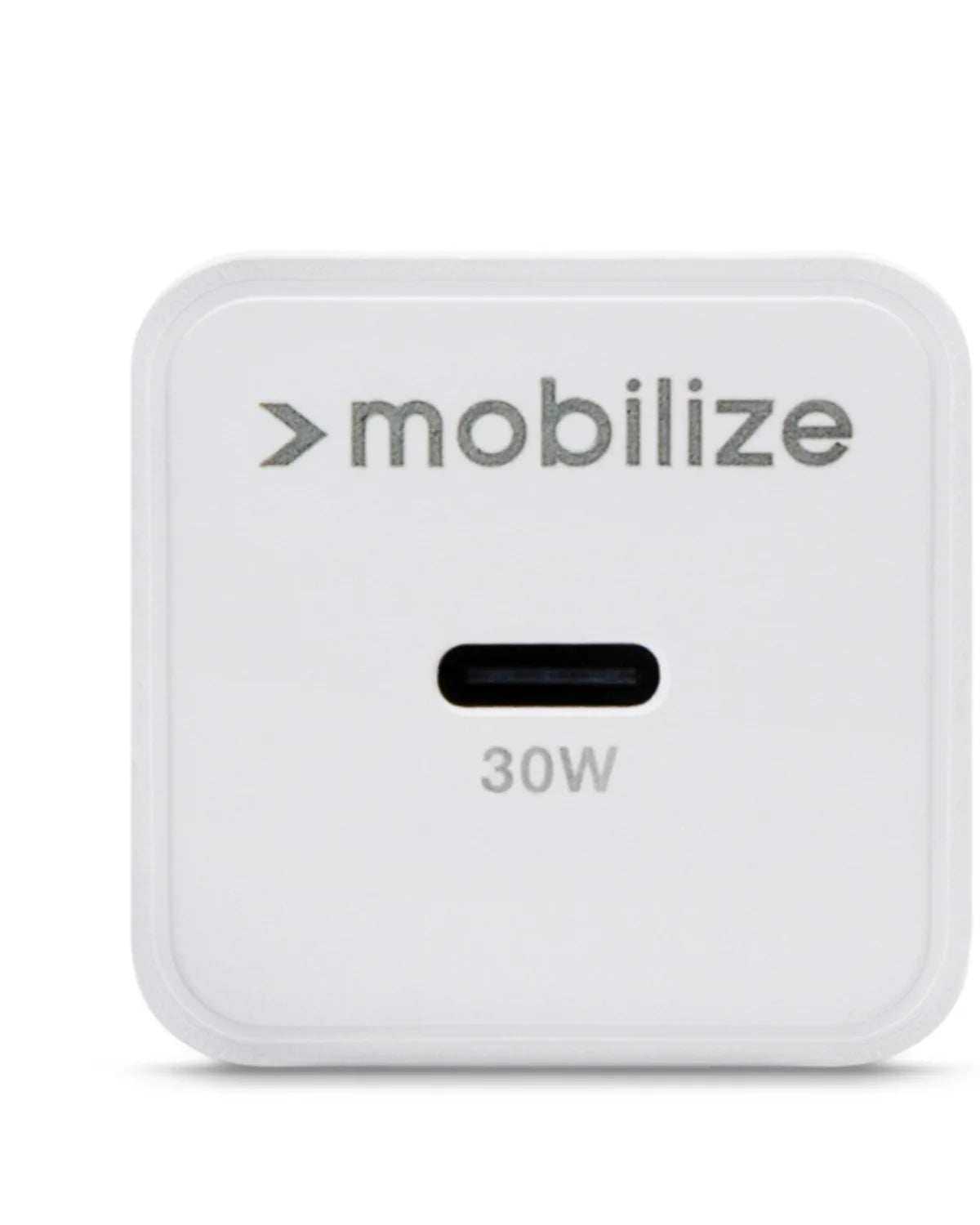 Witte 30W USB-C snellader van Mobilize met GaN-technologie en meegeleverde nylon USB-C kabel (1.2m). Ondersteunt PD en PPS voor razendsnel, veilig en efficiënt opladen.