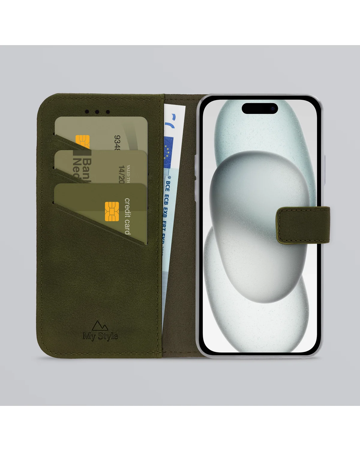 Geef je iPhone 15 een stijlvolle en natuurlijke uitstraling met de My Style Flex Wallet in bosgroen. Deze elegante wallet case is gemaakt van hoogwaardig kunstleer en biedt ruimte voor pasjes, papiergeld én optimale bescherming rondom je toestel.
