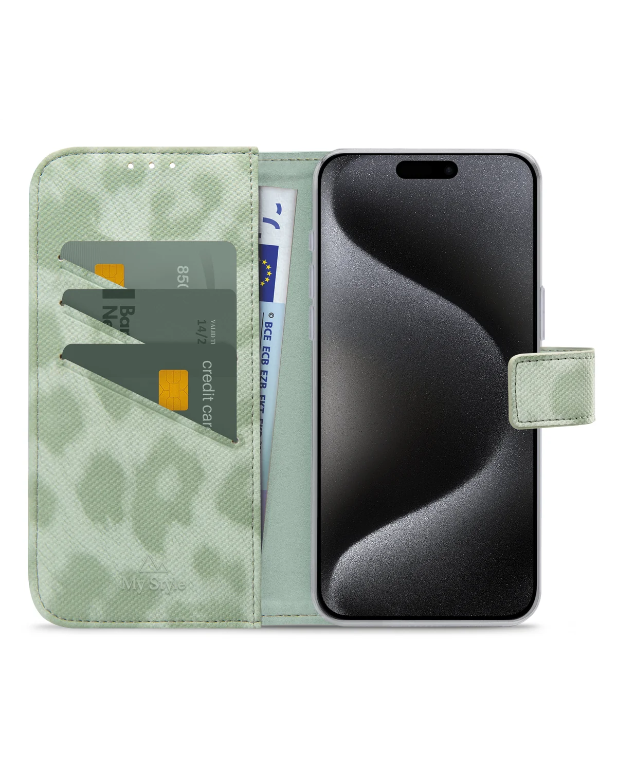 Kies voor een opvallende look en betrouwbare bescherming met de groene leopard My Style Flex Wallet voor je iPhone 15 Pro Max!