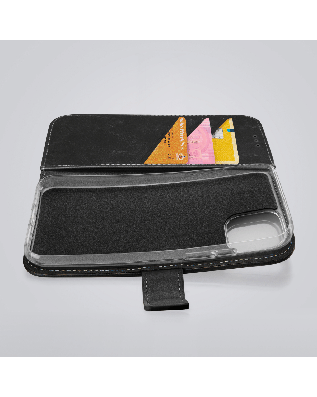 Extra eigenschappen: Magneetsluiting, Drie pasjesvakken, Extra opbergvak, Bescherming voor knoppen