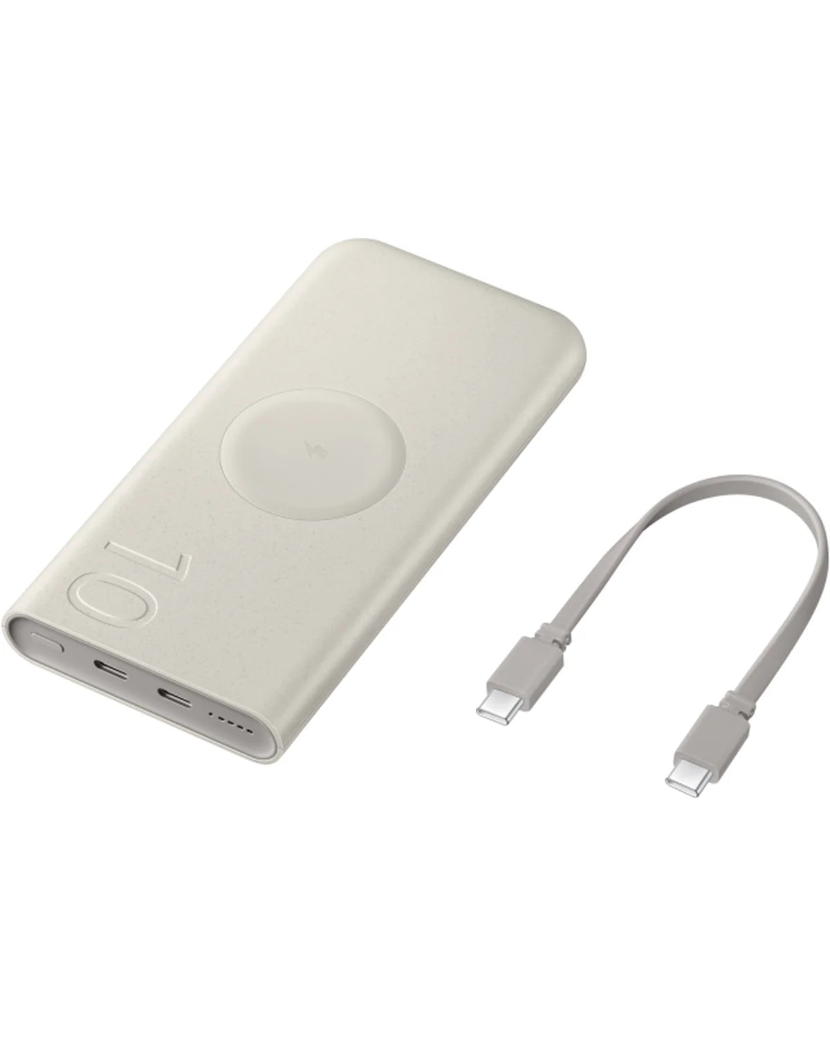 Onderweg altijd energie met de Samsung Wireless Battery Pack 10000mAh – 25W – Beige. Draadloos laden, 2 USB-C poorten en milieuvriendelijk design.