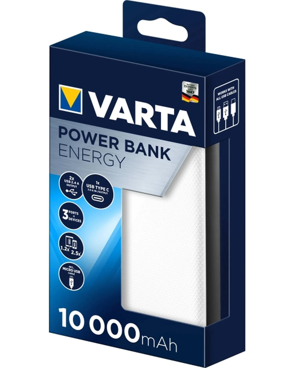 Compact en betrouwbaar opladen met de Varta Powerbank Energy 10.000mAh. Met 15W vermogen, 3 poorten en pass-through charging, ideaal voor dagelijks gebruik.